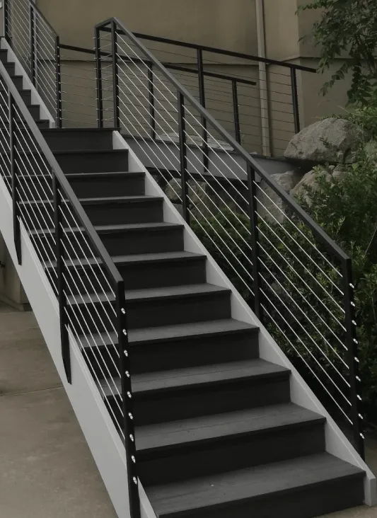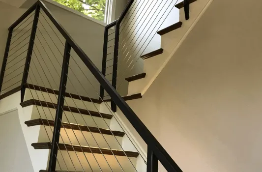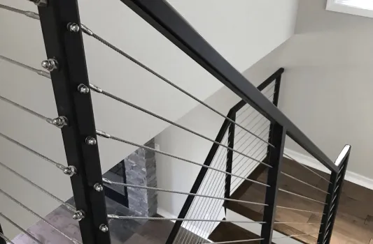 Carbon steel, aluminum or stainless steel frame filled with 3/16 dia stainless steel cables spaced 4" on center or less. Cap rail can be done in oak or walnut.